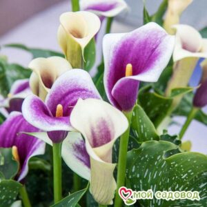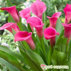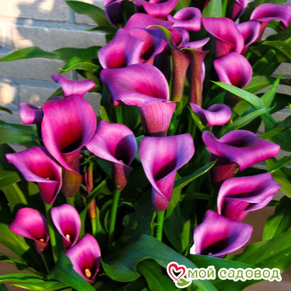Калла Пако — изысканный и необычный садовый сорт давно привлекает цветоводов. Их культура интересует за счет роскошных крупных бутонов, в которых поражает насыщенный сиреневый оттенок, местами переходящий в синий тон. При этом цветки практически не имеют запаха, что делает их идеальным решением для аллергиков. Диаметр бутонов варьируется от 6 до 8 см. Высота самой культуры с красивыми восковыми листьями составляет 50-60 см. Цветение июнь-сентябрь (в зависимости от срока высадки клубней). Количество цветков зависит от размера клубня, может быть от 3 до 10. ПОСАДКА М УХОД. Рано весной в горшки для комнатной культуры, в открытый грунт — после того, как минует угроза заморозков. Клубни  сажают на глубину 5-10 см и хорошо проливают почву, поскольку каллы любят влагу. Для посадки каллы подойдет притененный участок. Идеальный вариант, место под негустыми кронами деревьев. Чтобы было достаточно светло, а солнечные лучи не обжигали листьев. Очень эффектно смотрятся каллы, рядом с искусственным водоемом. Отлично цветет и растет только в тепле, где температура не ниже 18°C, самая оптимальная температура 22-23°C. Не переносит сквозняков. Цветоносы этого растения высокие, которые идут прямо от низа растения. На открытом воздухе это прекрасное растение цветет 1 месяц, а в закрытом помещении — 14 дней. Осенью растения сбрасывают листья. На зиму клубни каллы нужно выкопать и хранить в непромерзаемом помещении.